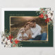 Celebre las fiestas de invierno con esta tarjeta de Navidad con una pintura de acuarela de poinsettia, acebo y bayas rojas en verde y dorado. Personalice fácilmente esta tarjeta de vacaciones con su foto y texto.