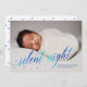 Tarjeta de felices fiestas impresa con tu foto que cubre toda la tarjeta. Noche silenciosa está escrita en una escritura delgada a través de ella y llena de un gradiente azul rodeada de pequeños copos de nieve azules.
