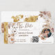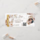 Destino México Boda Boda Embarcadero Pasar Boleto Plano de Oro Guardar la Fecha con icono de corazón y avión con flores de color boho. Añadir tu foto y código qr