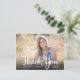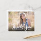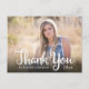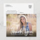 Esta tarjeta postal de agradecimiento de graduación cuenta con una foto horizontal que llena la parte frontal de la tarjeta. Lo que lee la caligrafía manuscrita: Gracias. El texto personalizado le permite agregar: el nombre del graduado, año de graduación y un mensaje personal de agradecimiento.