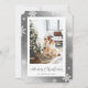Elegante foto de copo de nieve de plata. Tarjeta navideña de cereza con copos de nieve sobre fondo metálico de plata. Personaliza fácilmente esta tarjeta de vacaciones de fotos de plata con tu foto y texto.