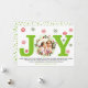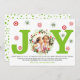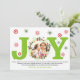 Tarjeta de vacaciones con foto de corona floral de Navidad y alegría verde lima. Muestra la palabra "ALEGRÍA" con copos de nieve rojos y verdes, y en lugar de la letra "O" hay tu foto en un marco de corona floral de Navidad. La parte posterior incluye confeti de lunares verdes lima.