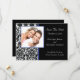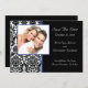 Anuncie a su futuro boda con nuestras tarjetas de anuncio Save The Date que presentan un hermoso patrón de damasco blanco y negro con un marco de foto recortado en azul oscuro. ¡Sólo tienes que añadir la información y la foto de tu boda y estás listo para irte! Estampillas y sellos para sobres de franqueo de correspondencia disponibles en nuestra tienda