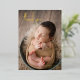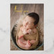 Simple tarjeta de anuncio de nacimiento para recién nacidos con "gracias" en un guión moderno junto con el nombre y fecha de nacimiento del bebé. Todo el texto del frente está en Relieve metalizado oro real. La parte de atrás tiene un collage de fotos con tres imágenes cuadradas junto con tu mensaje personal. Este elegante anuncio de nacimiento es una gran manera de anunciar el nacimiento de tu recién nacido o niña.