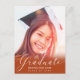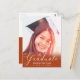 Anuncie su graduación 2020 a la familia y amigos con esta moderna invitación personalizada de foto grad y postal de invitación a la fiesta. La plantilla de diseño muestra su foto con un naranja quemado y un guión blanco escrito a mano moderno que dice "Graduado" y su nombre, y clase/año a continuación. La parte posterior de la tarjeta contiene más detalles de su graduación con la invitación del fiesta a su personalizar acentuado por un gorro de graduación blanco sobre un fondo naranja. ¡Felicitaciones por tu graduación! Diseñado por la artista Susan Coffey.