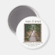 Un moderno ahorra la fecha en un formato imán único diseñado para acomodar tu foto de compromiso vertical favorita. "Guardar la fecha" aparece en la parte superior de la foto en bloques negros y letras de guiones, con sus nombres, fecha de boda y ubicación de boda debajo. Utilice la línea de texto adicional para compartir el sitio web de su boda o detalles adicionales.