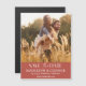 Un moderno ahorra la fecha en un formato de tarjeta magnética único diseñado para acomodar tu foto de compromiso favorita. "Guardar la fecha" aparece en la parte inferior de la foto en bloques blancos y letras de guiones, con sus nombres, fecha de boda y ubicación de boda debajo de un fondo de terracota. Utilice la línea de texto adicional para compartir el sitio web de su boda o detalles adicionales.