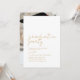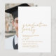 Desee su buena suerte graduada con esta sencilla y elegante invitación a graduarse. La invitación presenta un diseño elegante, con un fondo blanco y suave. En el centro, los detalles del fiesta son hermosamente tipos de letra de guión en un texto dorado que exudan un aire de sofisticación. En la parte trasera hay espacio para una foto. Invite a los huéspedes a su fiesta de graduación con este sencillo diseño. El color de fondo y el texto son editables.