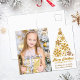 Una postal de Navidades de guión de oro de moda con una fotografía familiar junto a un hermoso árbol hecho de copos de nieve dorados sobre Feliz Navidad y Feliz Año Nuevo. Postales vacacionales de moda con un diseño artístico de copos de nieve.