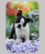 Una joven cachorro adorable de Boston Terrier, negra con marcas blancas, en un jardín florido. Los Boston Terriers, también llamados Toros de Boston o "Caballeros Americanos", son una raza de perro gentil, amigable e inteligente para la compañía. Una foto de perrito con ojos de perrito tomada por Katho Menden, este pullover para los chicas es una idea de regalo encantadora para los amantes del perro.
