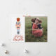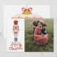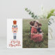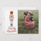 Esta tarjeta de Navidad del Cascanueces es un recordatorio de días pasados, con un toque moderno. El diseño presenta un cascanueces navideño vintage rosa y rojo sobre un fondo blanco. Dice "Deseándote una Feliz Navidad" con un espacio para agregar tu foto favorita. En la parte posterior hay otro adorno con un mensaje que puedes personalizar y agregar tus nombres.
