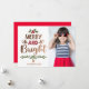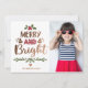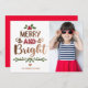 Tarjeta de felicitación de foto de vacaciones de Navidad roja, verde y dorada divertida y linda. Las palabras Merry y Bright están en el diseño adorable de un árbol de Navidad con poinsettias rojas y hojas de acebo verdes en la parte superior. Personalice con su foto y texto. El color de fondo de esta tarjeta es personalizable, al igual que el texto.