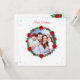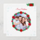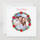 Moderna foto familiar personalizado, corona de pino decorada con boletus y Navidades con copos de nieve. Texto listo para ser personalizado.