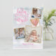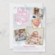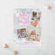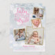 Una elegante tarjeta de anuncio de nacimiento festivo con 4 fotos para personalizar con tus fotos especiales enmarcadas en oro, mensaje navideño, nombres y estadísticas de nacimiento. La parte posterior presenta copos de nieve que caen. Puedes personalizar el color de fondo para que coincida con tu tema navideño. Diseñado por Thisisnotme©