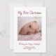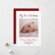 Tarjeta de felicitación moderna de la Primera Navidad, con un lindo tema de bebé y letras de tipografía roja de personalizable. Con una plantilla de foto, usted reemplaza con su propia foto de bebé. Ideal para anunciar su familia en crecimiento esta temporada de vacaciones.