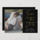 Este elegante e informal salva la fecha presenta una foto (orientación retrato) y caligrafía moderna que dice "Save the Date" (Salva la fecha) con letras doradas en un fondo negro. Personalizar con sus nombres, fecha de boda y ubicación del boda debajo de la tipografía del guión oro. El personalizable de la tarjeta puede acomodar información adicional y fotos.