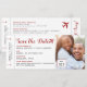 La tarjeta de embarque de temas de viajes divertidos permite guardar la fecha de una boda de destino con un lugar para añadir la foto y los detalles del viaje. Un bonito logo del corazón del avión y detalles de los billetes de avión retro que incluyen flechas, código de barras y una caja de asignación de asientos en una fuente vintage del ordenador. Si simplemente quieres correr la voz mientras trabajas los planes de viaje y excursiones, el diseño de la parte de atrás se puede borrar por completo, solo tienes que hacer clic en 'personalizar más lejos'. Los destinos de uva de papel se especializan en invitaciones temáticas de viajes y papelería de día de bodas de destino para la pareja aventurera, de lujuria que planea sus nupcias en el extranjero.
