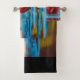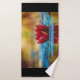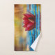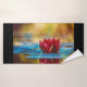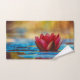 Toalla puesta con una fotografía de un estanque con una hermosa flor de loto rojo saliendo por encima.
