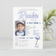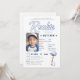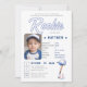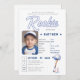 ¡Celebra que tu pequeño loguero se convierta en uno con esta divertida invitación de cumpleaños con tema de béisbol! Con un audaz cartel de "novato del año", un espacio para la foto de su hijo, y divertidas estadísticas personalizadas (como "BATS: CON CAKE"), este diseño lo saca del parque. Un encantador ilustracion acuático de un bate de béisbol con una gorra en la parte superior y una bola en las cercanías le da un toque deportivo y alegre. Con un acento clásico rojo y azul marino, esta invitación es perfecta para una gran celebración de una familia amante del béisbol.
