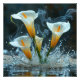 Lilias calas delicadas con pétalos blancos y espádices naranjas vibrantes, emergiendo de una superficie de agua serena. A medida que el agua salpica alrededor de ellas, gotas se adhieren a las flores, añadiendo un aspecto fresco y vibrante. Jirones de vapor o niebla giran alrededor de las flores, realzando la cualidad etérea de la escena. El fondo tiene un tono suave y apagado, lo que ayuda a resaltar la belleza y claridad de las flores y el movimiento dinámico del agua. En general, la composición evoca una sensación de tranquilidad y elegancia.