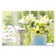 "El Dios de la Esperanza te llena de alegría y paz" Romanos 15:13 Foto Inspiradora de la cita de la Biblia Verse. Impresión con una hermosa margarita amarilla suave y un fondo fotográfico de flores de ojos negros-susanos con luz del sol brillando sobre un ramo en un jarrón azul claro sentado en una silla rústica encalada contra un exuberante fondo verde. Hermosa y vibrante fotografía impresa con una inspiradora cita motivacional en la elegante y moderna tipografía de escritura. Ideal para una mini meditación en casa o en la oficina.