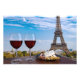 Dos copas de vino tinto con tentempiés con vistas a París y la Torre Eiffel. Vidrio de vino tinto con diferentes tentempiés - plato con jamón, rebanado, queso azul. Pareja, celebración romántica. Cafetería con vistas