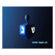 Un modernístico dreidel azul metálico contra un fondo oscuro y nocturno. Dos de las letras hebreas encontradas en un dreidel, una monja y un shin, brillan brillantemente. El texto en hebreo que dice "Chag Chanukkah Sameach" (Feliz Hanukkah) también aparece en azul y blanco resplandeciente.