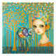 Un elefante estilizado y colorido se alza junto a un chica con ojos grandes y un gorra caprichoso y con estampado. Árboles brillantes y punteados y vibrantes rayas verticales llenan el fondo con una sensación de fantasía y asombro. Photoshop CS5 de arte digital