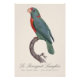 Le Perroquet Langlois es una llamativa ilustración histórica atribuida al célebre artista francés Jacques Barraband, conocido por su excepcional precisión en el arte ornitológico a finales del siglo XVIII y principios del XIX. Esta obra de arte muestra un loro verde vibrante con una distintiva garganta y pecho rojos, posado elegantemente en una rama curva. La composición refleja el dominio de Barraband del color, la textura y la precisión anatómica, lo que hace que el ave parezca a la vez realista y artísticamente idealizada. El nombre "Langlois" no se refiere a la especie en sí, sino a Langlois, el maestro impresor responsable de producir los exquisitos grabados en color que aparecen en Histoire Naturelle des Perroquets.