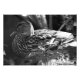 Fotografía en blanco y negro de un pato sentado en la orilla del río mirando hacia el agua.