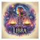 Adquiera la gracia y armonía de Libra con esta impresionante obra de arte celeste. Con una figura divina parecida a una diosa, su cabello fluido iluminado por el polvo estrellado cósmico, simboliza la paz, el amor y el equilibrio. Las escalas doradas de la justicia, brillando con una luz etérea, reflejan la búsqueda de equilibrio y equidad por parte de Libia. Esta pieza, envuelta en vibrantes remolinos de violeta profunda, azul cósmico y rosa suave, encarna perfectamente el encanto venusiano y la belleza estética de Libia. Un regalo ideal para los libios, los amantes de la astrología y los que aprecian la elegancia en el diseño.
