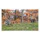 Un zorro y un mapache se miran entre ellos como si se preguntaran qué hacer a continuación. Fondo del color otoñal.