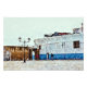 Una obra de arte abstracta y vibrante que presenta una escena callejera con edificios geométricos y lámparas en la calle. La composición artística incluye colores vivos y figuras que caminan por la calle, creando un ambiente urbano dinámico.
