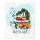 Un ilustracion divertido y moderno de una playa tropical con palmeras, océanos de surf con surfistas, una hermosa mujer vestida en bikini, hermosas flores y un viejo autobús de camioneta hippy. Gran diseño para los amantes de la playa.