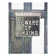 Diseño artístico de la antigua puerta de la oficina de reservas en el andén de la estación de tren con advertencia de no admisión y cuidado con los trenes de la era del tren de vapor.