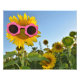 Polka rosa pone gafas de sol sobre girasol en un campo de girasoles.