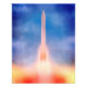Un cohete espacial plateado explota hacia arriba y hacia arriba en los cielos azules de arriba mientras sus gases y gases naranjas, blancos y rojos explotan hacia abajo propulsando este misil desde su plataforma de lanzamiento. Arte de pintura con aerosol del artista Jason Girard.