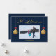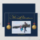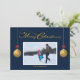 Diseño de tarjeta de Navidad azul oscuro con caligrafía "Feliz Navidad" para foto familiar. Puedes personalizar esta tarjeta para agregar el nombre de tu familia y foto para reemplazar la foto de muestra. Esta tarjeta está diseñada para que también puedas cambiar el color del fondo azul así como el color del gráfico "Feliz Navidad" si lo deseas.