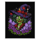 The February zombie witch with February's flowers and gems. She wearing a purple hat with a red band and a patch. She has green skin, one red eye and one white eye. An red and black cape is draped around her shoulders, fastened with a skull clasp. The witch is surrounded by purple violets and amethyst, set against a black background. The overall mood is spooky and fantastical.