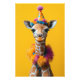 Una encantadora jirafa de bebé se vistió para una celebración, usando un gorra festivo de fiesta con patrones coloridos y decoración esponjosa. La jirafa tiene una boa de plumas mullida y multicolor y se alza sobre un fondo amarillo brillante, creando una escena alegre y caprichosa.