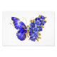 Joyería, azul, zafiro, mariposa floral brillante con ala decorada con flores azules y preciosas con hojas de oro sobre fondo blanco.