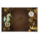 Fondo de madera marrón con mar, cresta mecánica, volante antiguo, ancla dorada y varios engranajes de oro y latón. Estilo Steampunk.