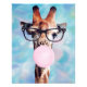 Girafa con gafas y un fondo de chicle azul chicle rosado con nafas.