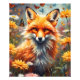 Ein hübscher kleiner Fuchs schaut dich an. Er sitzt zwischen Blumen und spielte mit Schmetterlingen.