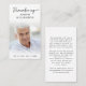 Foto Funeral Recordando El Nombre De La Tarjeta Oradora Moderna. Mantenga la memoria de un ser querido cerca con esta tarjeta de oración personalizada personalizado que incluye una foto atesorada, el título NOMBRE RECORDANTE, fechas y un mensaje de recuerdo sentido editable. Con su sencillo diseño clásico en blanco y negro y su moderna tipografía manuscrita, hace un gran placer para compartir en un funeral, servicio conmemorativo o celebración de la vida y ofrece confort y un homenaje duradero para la familia y amigos. Su tamaño pequeño y portátil de 3,5x2" (tamaño de cartera) hace que sea conveniente para los seres queridos llevarlo con ellos como recordatorio de la vida y el espíritu de su ser querido.