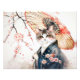 Un sofisticado felino adornado con un profundo kimono azul, sostiene un paraguas de bambú, rodeado por una suave cascada de flores de cerezo al estilo de la pintura china de tinta.