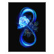 Luminous infinity symbol with glowing, beautiful, lushly blooming rose made of blue flames on black background.