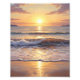This is a serene and painterly depiction of a sunset over the ocean. The image captures the golden hour, with a bright sun descending and reflecting intensely on the water's surface, creating a sparkling path to the shore. Warm hues of orange, yellow, and soft pink dominate the sky and clouds. The foreground shows an active shoreline with waves breaking, rendered in beautiful detail with white foam and sea spray washing over the wet, sandy beach. Distant mountains or islands frame the horizon, adding depth. The style appears to be digital painting or oil/acrylic on canvas.