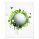 Ilustracion moderno con el golf como tema. Una bola de golf representa la Tierra con golfistas y banderas a su alrededor en tonos verdes. Diseño divertido y moderno para los amantes del golf.