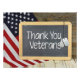 Gracias a los veteranos en el pizarrón negro con etiquetas militares de perro en la bandera estadounidense.